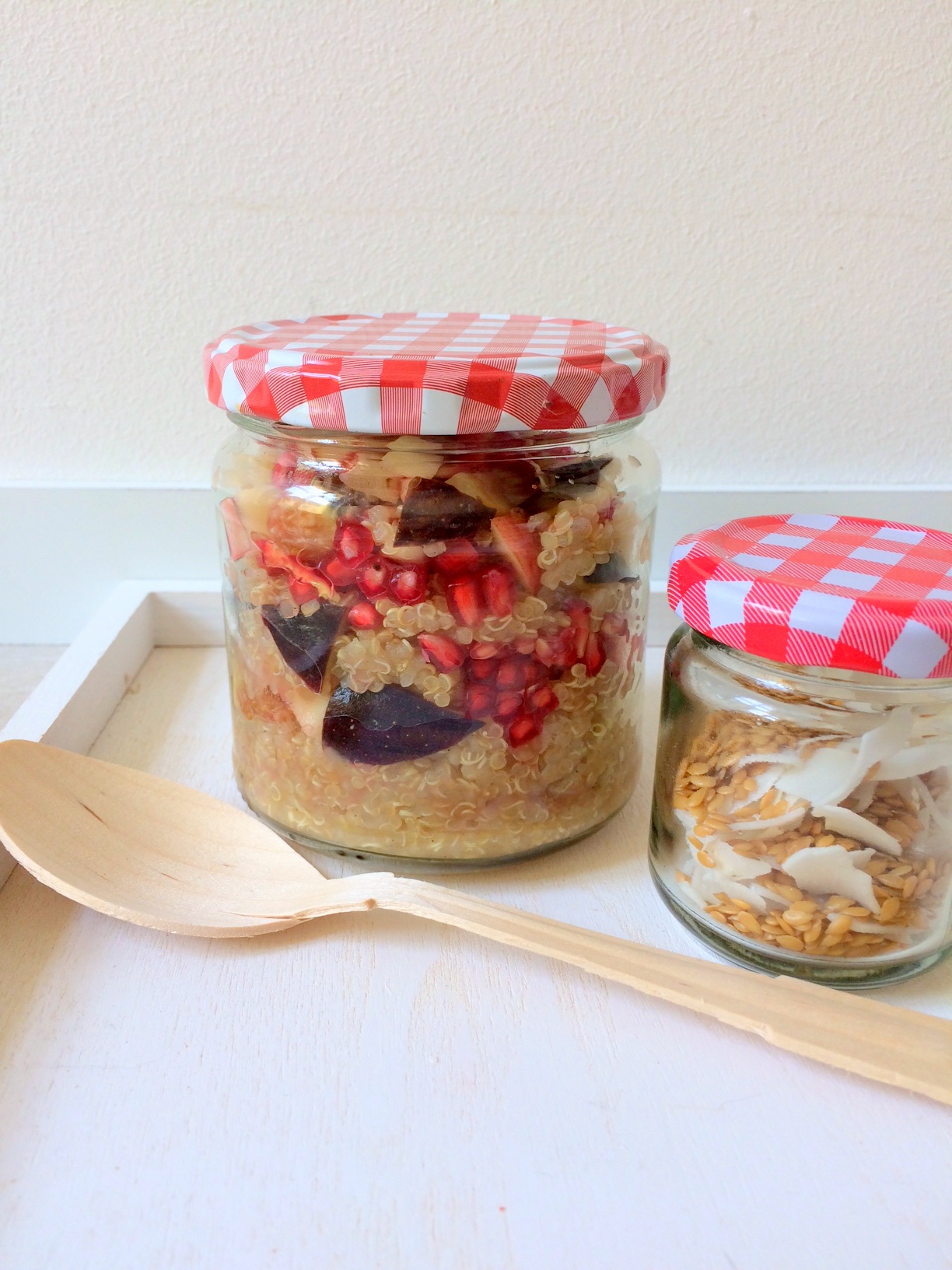 Quinoa-Müsli-to-goAlle, die sich ein nährstoffreiches Müsli ohne Gluten mit kulinarischem Aha-Effekt wünschen – egal ob zum Mitnehmen oder zum Genießen in den eigenen vier Wänden – liegen mit diesem veganen Müsli Gold richtig. Kurz vor dem Servieren wird das saftige Müsli, welches mit lieblicher Vanille und Zimt verfeinert wird, mit einer Knusper-Mischung aus Gold-Leinsamen und Kokoschips bestreut. Für die fruchtig süße Note sorgen Apfel, Feige und knusprige Granatapfelkerne. Wer das Rezept – inklusive essentieller Aminosäuren, Eisen, Omega-3-Fettsäuren und Co. mal testen möchte, findet hier alle Zutaten:)