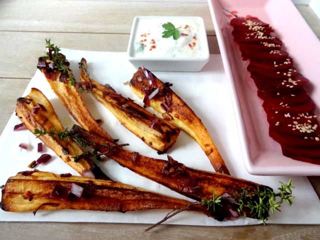 Dieses winterliche Rezept basiert auf aromatisch gebackenen Pastinaken, die im Ofen einen raffinierten Mix aus lieblichem, soften Inneren mit einer knusprigen Hülle entwickeln. Eine tolle Alternative zu Pommes à la Fingerfood 🙂. Die fruchtig-frischen Nuancen des Rote Beete Carpaccios – inklusive einer Extraportion Eisen – runden dieses vegetarische Gericht ab. Appetit bekommen? Dann unbedingt einen Klick auf die Zutaten samt Zubereitung wagen 🙂
