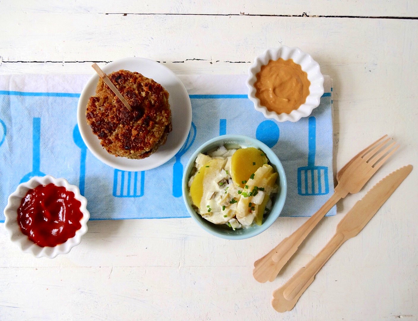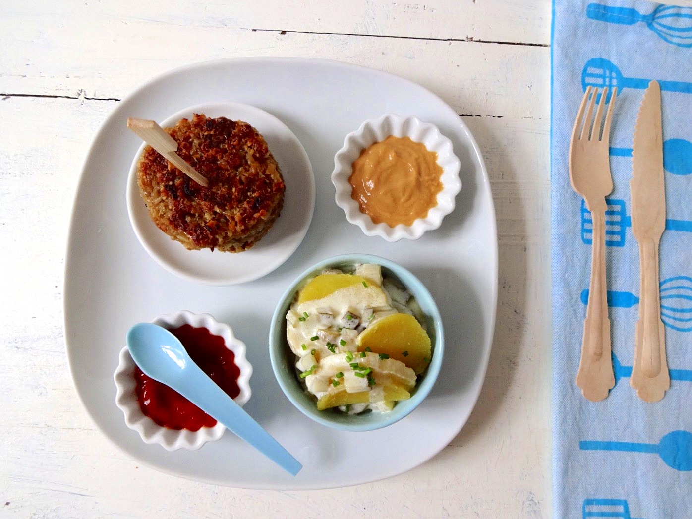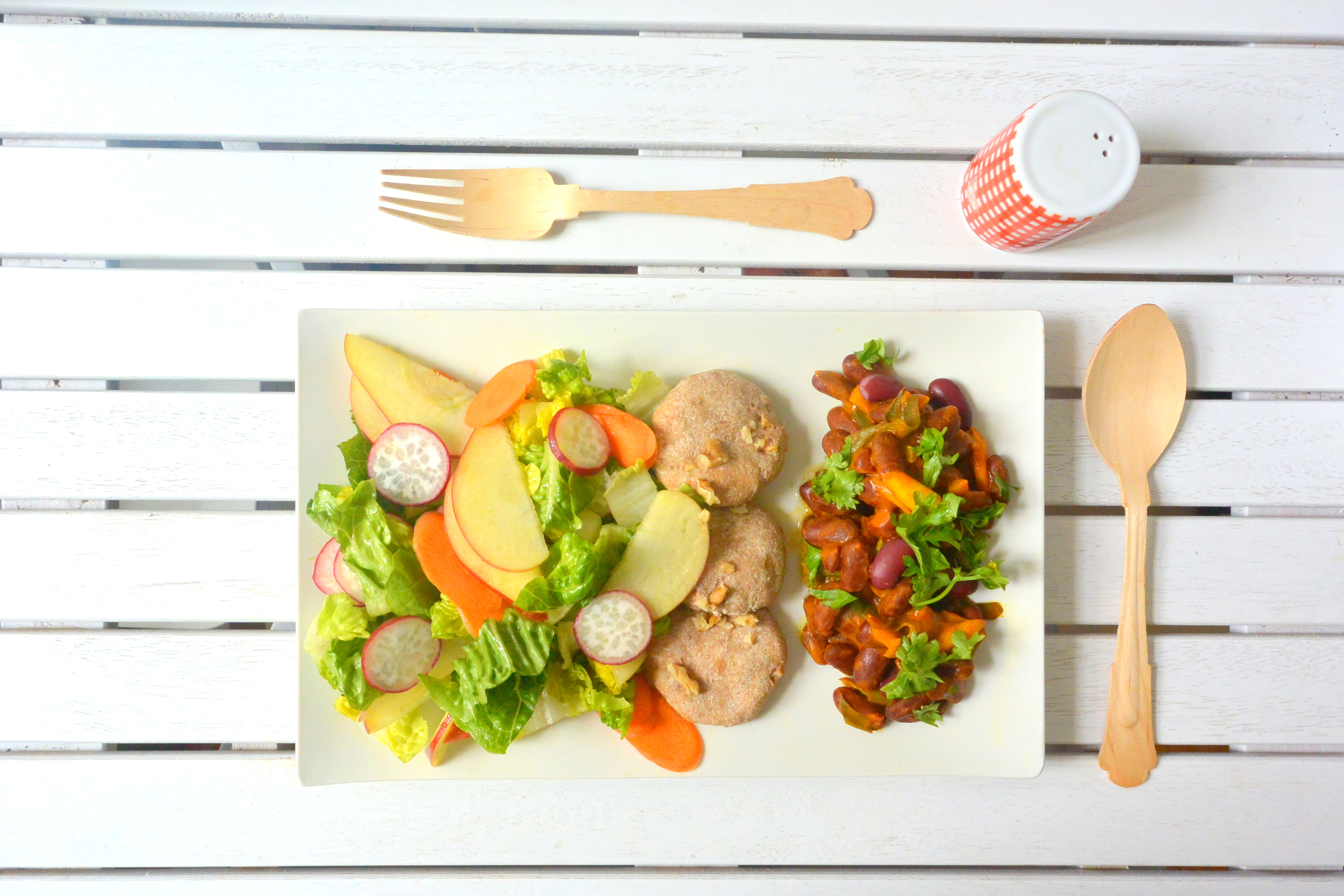 Für die fruchtige Salat-Variation inzwischen den Saft 1 kleinen Orange mit 1 EL Leinöl und etwas Salz vermischen. Ein kleines portioniertes Salatherz, feine Scheiben von 1/2 Apfel, 1 Möhre und 3 Radieschen unterheben und nochmals abschmecken. Mit den knusprigen Walnuss-Dinkel-Talern und den feurigen Chili-Bohnen servieren 🙂